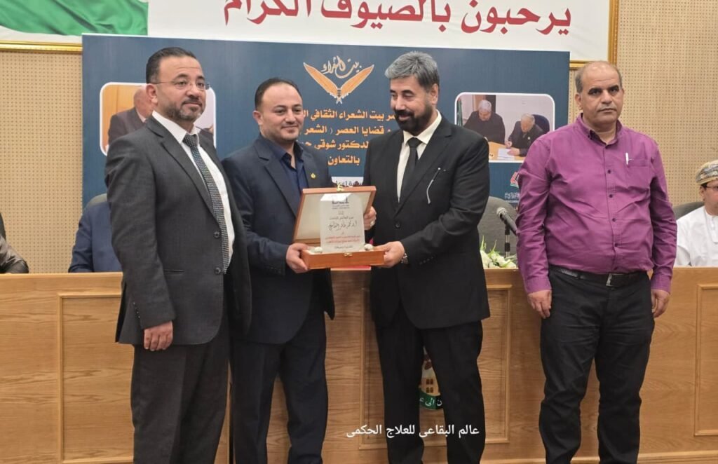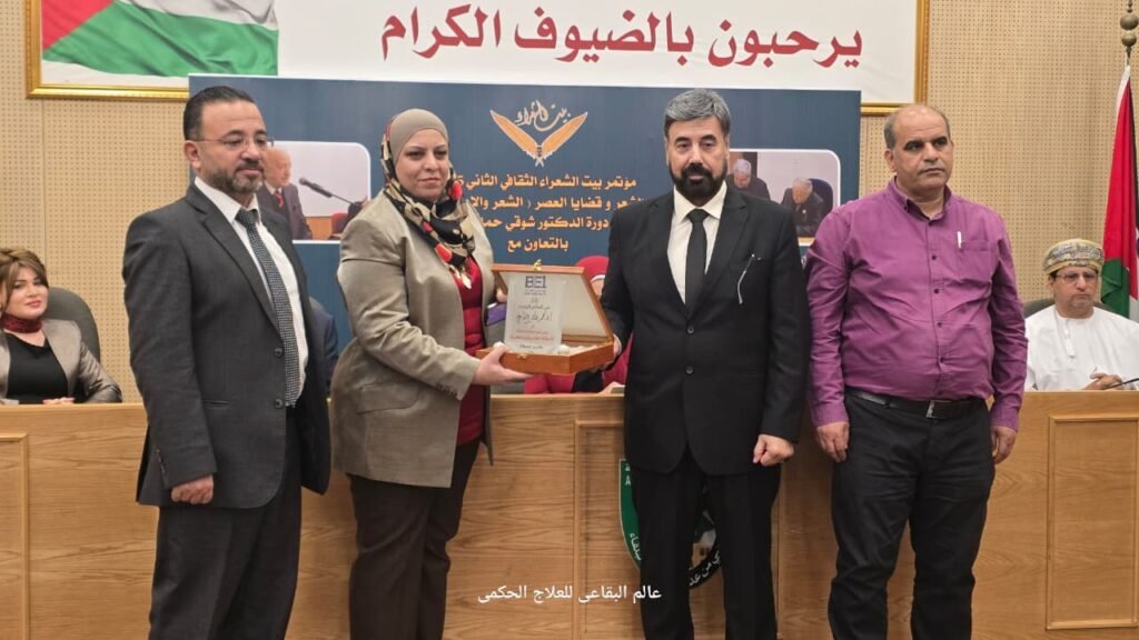In a thoughtful gesture that reflects the spirit of gratitude and teamwork, Body Engineer Dr. Mohammad Khaled Al-Buqai honored Ms. Ahlam Al-Rawabdeh, Director of Public Relations at Irbid University College, and Mr. Hamad Ayadat, Head of the Computer Department, in appreciation of their outstanding efforts in ensuring the success of the Second Poets’ House Cultural Conference 2025, hosted by the college with the participation of prominent poets, writers, and media figures from across the Arab world.