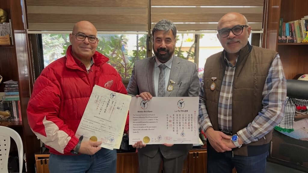 At the conclusion of the visit, Dr. Hanshi Mohammad Khaled Al-Buqai, Chairman of the Board of Shotokan Karate, awarded 9th Dan Black Belt certificates in Shotokan Karate to Counselor Dr. Mohammad Al-Dabardash and Mr. Salah Al-Ghazali, in recognition of their distinguished careers and continuous support for the sport—an initiative that reflects the depth of cooperation and mutual appreciation between sports leaders.